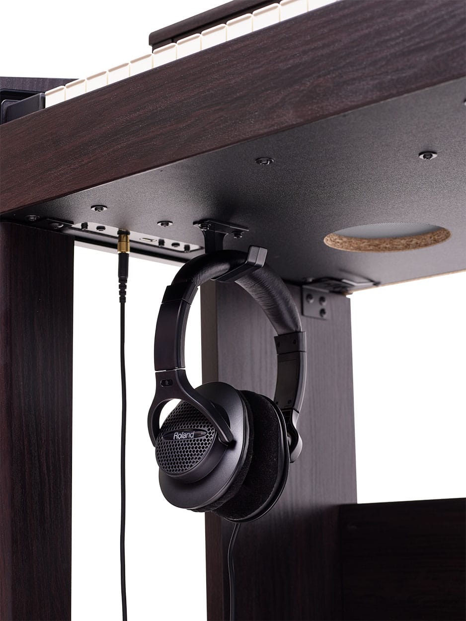 さらにBluetoothオーディオ機能では、スマートフォンとRP701を無線で接続。スマートフォンのお気に入りの曲や動画の音楽など、RP701本体のパワフルなスピーカーで再生して、聴いて楽しむことも。さらには音楽アプリを使って、効果的にスキルアップも可能です。日中はスピーカーからの豊かな音を体感しながら、そして朝や夜には、周囲に配慮したヘッドホンでの練習することも。ピアノに触れる時間を増やすことが上達への一番の近道です。前脚を備え、高級感がありながら安定感を持つデザインも人気のポイント。